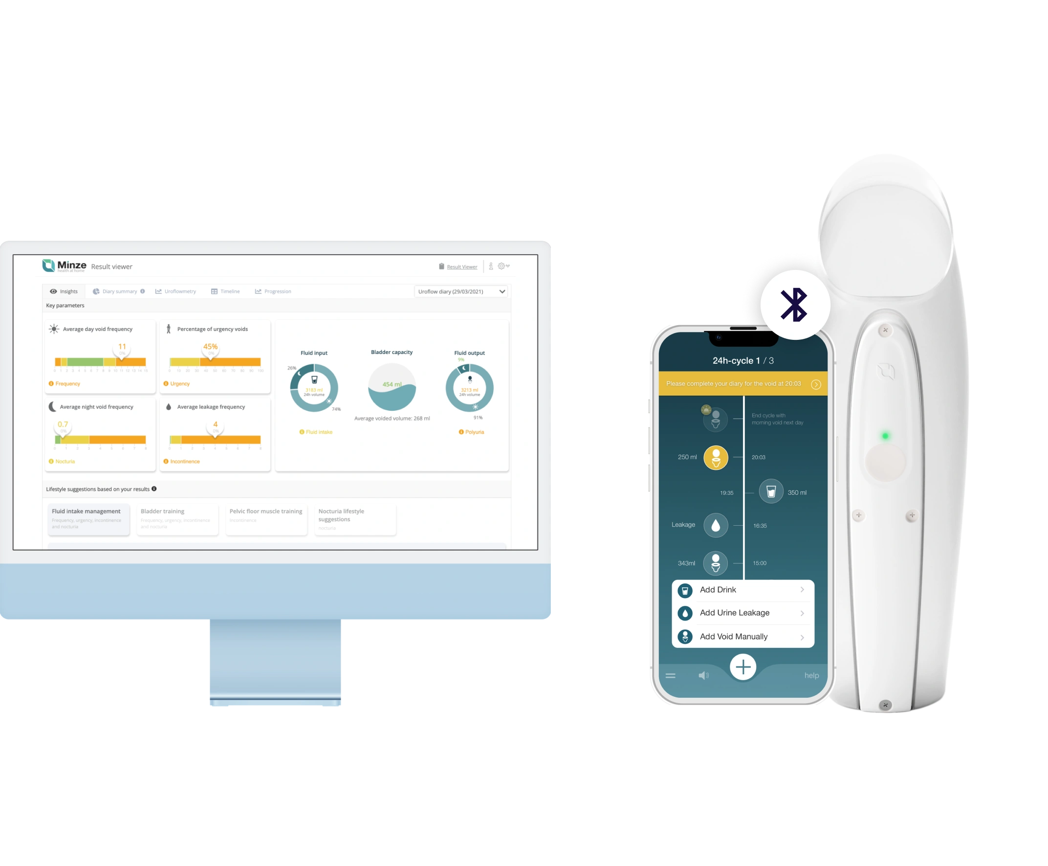 The Minze app guides and educates patients to complete a bladder diary, while the portable Diary Pod automatically stores and syncs measured volume and time. In doing so, the Minze Diary Pod establishes a more reliable baseline for treatment tracking and offers actionable first-line behavioral education to the patient. The integration of the sensor and guided app boosts patient engagement and adherence to treatment.