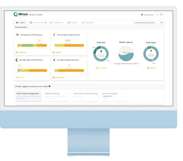 The Minze Diary Pod not only records voiding parameters, urgency sensation, and liquid intake parameters but also educates patients about how these parameters relate to Lower Urinary Tract Symptoms. It offers personalized first-line recommendations, from adjusting fluid intake to bladder training techniques. This educational element saves valuable time for your practice in patient education.